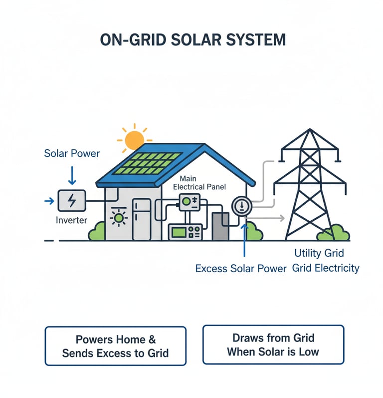An on-grid solar system connects your home directly to the electricity grid, helping you save money by generating your own clean power and sending the extra back to the grid.